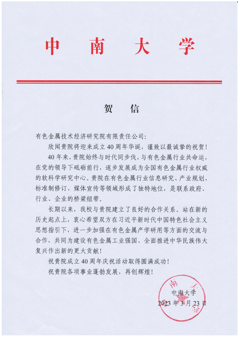 喜迎建院40周年|中南大学向我院发来贺信