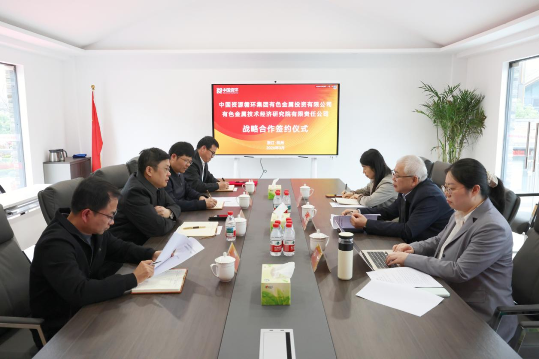 3月16日,有色金属技术经济研究院有限责任公司(以下简称“有色技经院”)与中国资源循环集团有色金属投资有限公司(以下简称“资环有色”)在杭州举行会谈并签署战略合作协议。有色技经院副总经理赵永善,资环有色党委委员、副总经理符胜斌、王强出席活动。